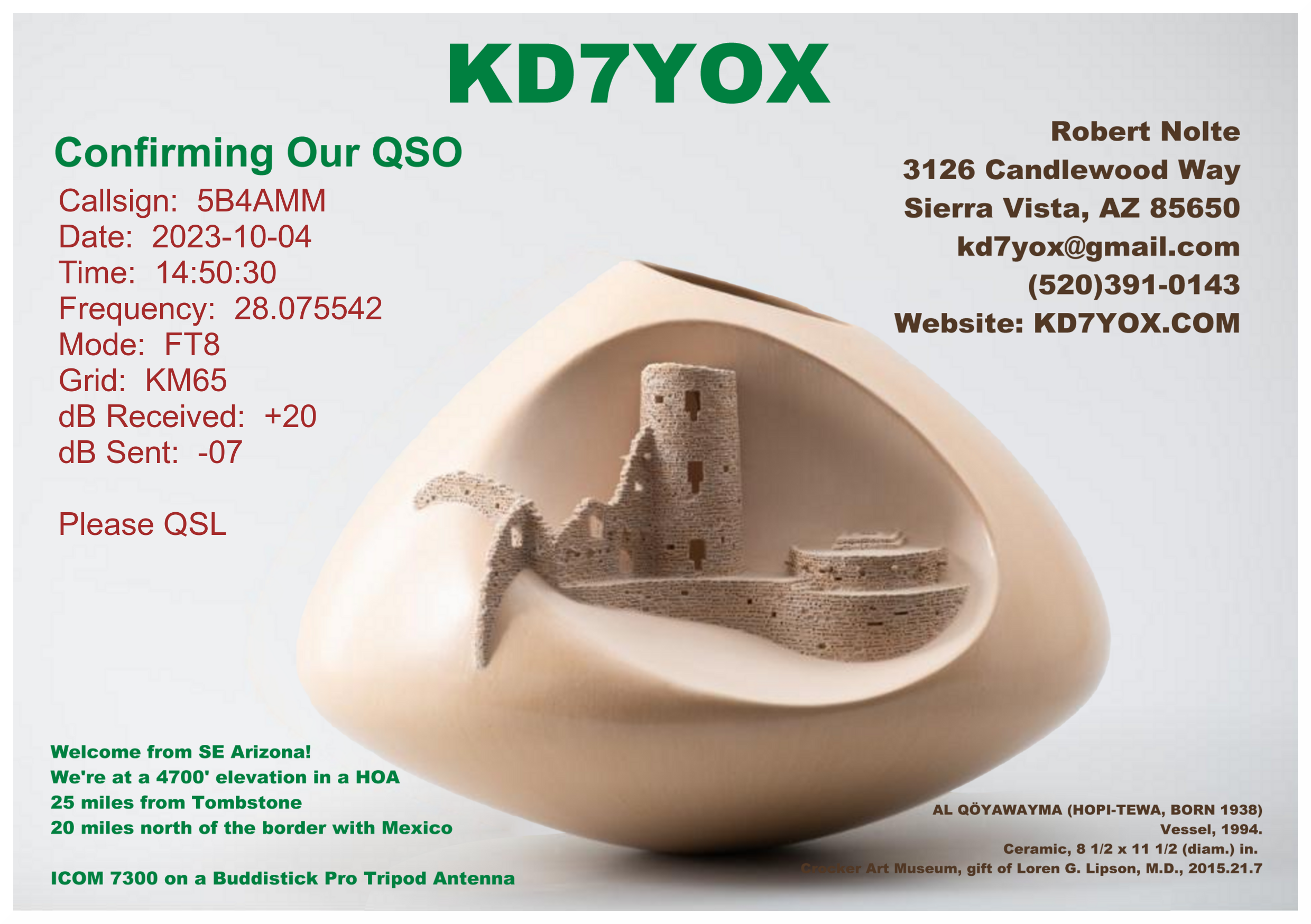 | Adding QSO Data to the Image I use the Imagemagick app, which is free and open-source, to write the qso data onto a new version of the card which is specific to this qso. The data comes from the WSJTx.log file. This image is saved with the date and callsign of this qso in its filename. Here is a sample: |